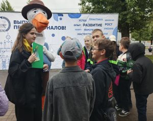 Организовывали работу площадки волонтёры, среди которых были обучающиеся 3 курса специальности Преподавание в начальных классах: Анастасия Кондратьева, Юлия Белецкая и Олеся Борисова. Всех посетителей встречал Пеликан, символ педагогического труда, с которым с удовольствием фотографировались школьники.