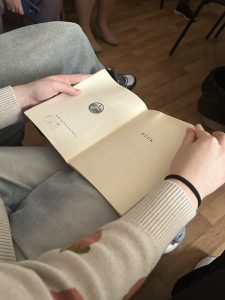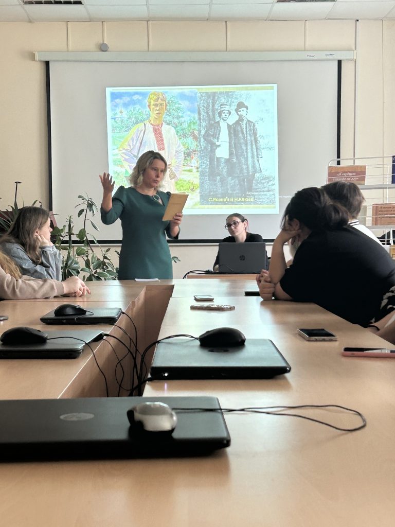 14 октября в читальном зале Смоленского педагогического колледжа прошло увлекательное мероприятие, посвящённое исторической дате – 130-летию со дня рождения поэта Сергея Есенина. Мероприятие организовали сотрудники Смоленской областной универсальной научной библиотеки имени А.Т. Твардовского и работник читального зала колледжа, а гостями этой увлекательной гостиной стали 30 обучающихся группы 1.КП вместе с преподавателем литературы Галиной Соловьевой. У ведущей программы Ольги Таршиной, руководителя центра по продвижению чтения, получился свой оригинальный взгляд на личность и творчество поэта, подкреплённый видеосюжетами, материалами книжной выставки, фотографиями, записями песен и даже рэпа на стихи Есенина.