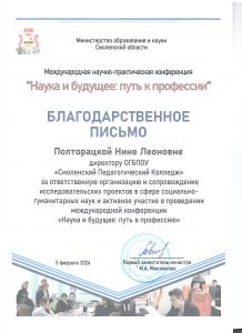Кроме того, за личный вклад в развитие исследовательской деятельности и ответственное руководство проектами директор колледжа Нина Полторацкая была отмечена Благодарственным письмом Министерства образования и науки Смоленской области.