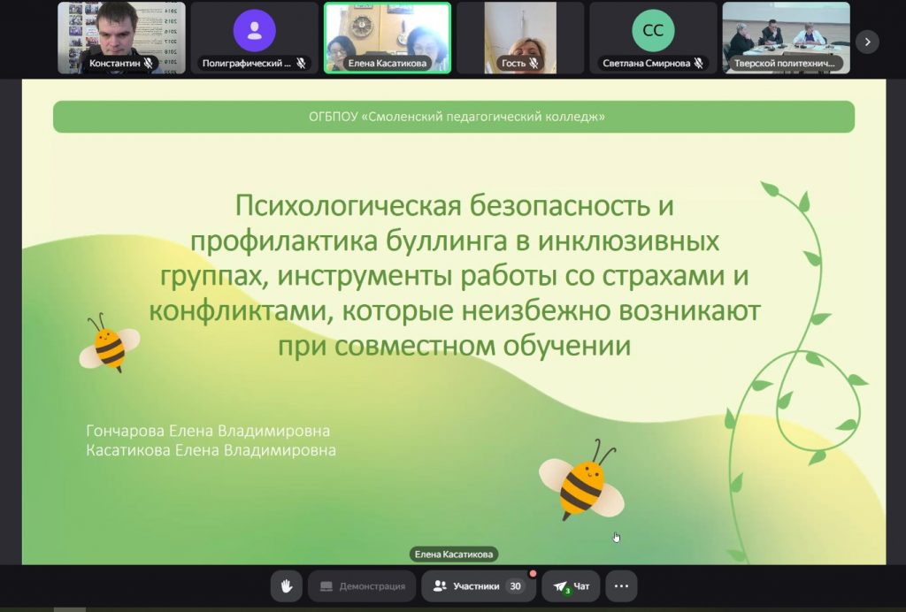 В рамках межведомственных взаимодействий в программе круглого стола с выступлением по теме «Психологическая безопасность и профилактика булинга в инклюзивных группах, инструменты работы со страхами и конфликтами, которые неизбежно возникают при совместном обучении» приняли участие руководитель БПОО Смоленской области, заместитель директора по инклюзивному профессиональному образованию Константин Веселовский, методист БПОО Елена Касатикова, педагог-психолог Елена Гончарова.