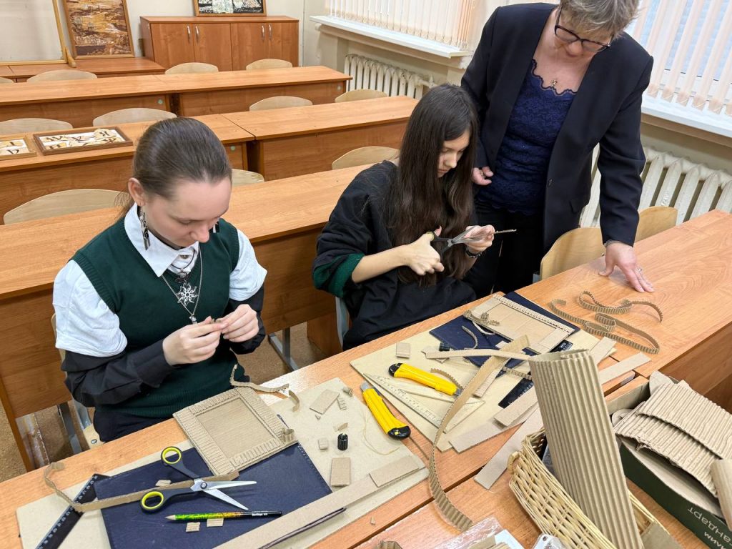 Участники профессиональной пробы получили представления о проектировании предметов интерьера из гофрированного картона и изготовили рамку для зеркала (фотографии, картины).