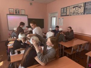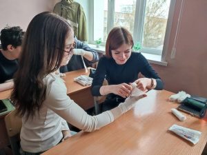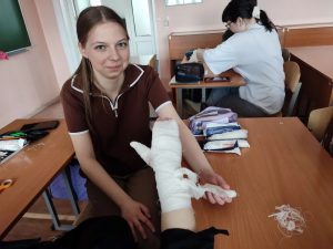 Преподаватель Наталья Борькина организовала для обучающихся полноценный тренинг. Студенты разбились на пары и учились накладывать тугие и стерильные повязки на нижние и верхние конечности, а также на голову. Занятие прошло в формате «равный – равному», что помогло снять излишнюю тревожность: ведь примерять роль пострадавшего и спасателя пришлось на друзьях по группе.