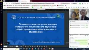 Участие в работе Круглого стола в качестве докладчика приняла Елена Гончарова и представила опыт создания психолого-педагогических условий успешности инклюзивного обучения в рамках среднего профессионального образования на примере работы базовой профессиональной образовательной организацией (БПОО) ОГБПОУ «Смоленский педагогический колледж».